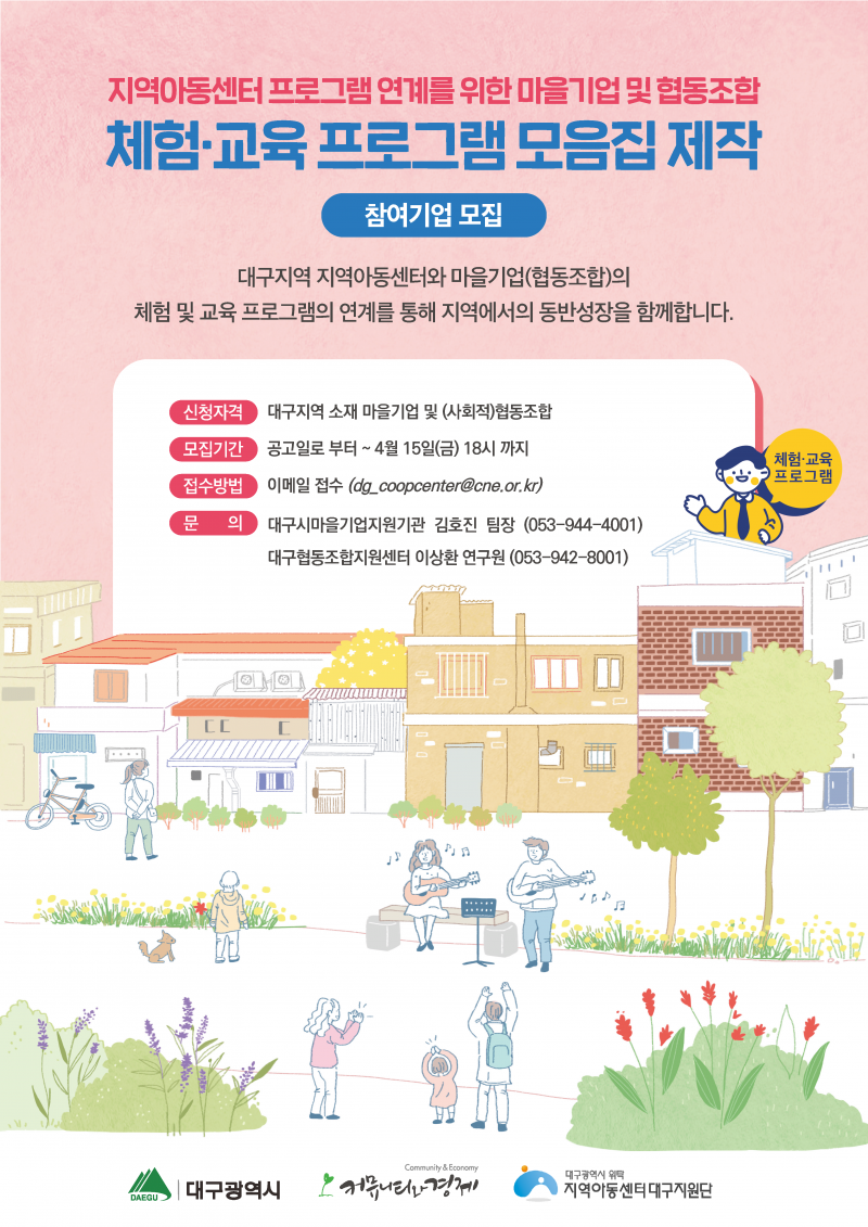 - 대구시 소재 200개 지역아동센터의 사회적경제 조직 간 연계를 촉진하기 위해 마을기업 및 협동조합의 체험 및 교육프로그램 모음집을 제작하고자 함.